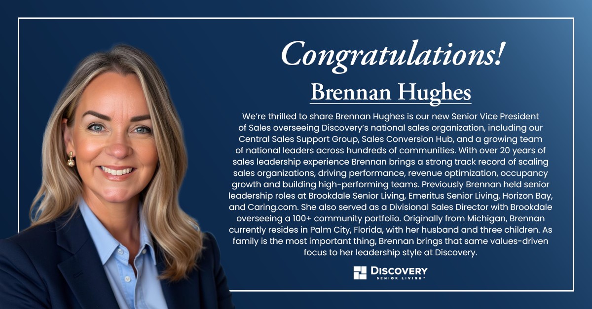 “With an extensive industry track record and innovative vision for the future, we are thrilled to have a strategic leader of Brennan’s caliber head up our Sales teams as they execute during the next phase of Discovery’s growth,” said Richard Hutchinson, CEO of Discovery Senior Living. “This appointment from within also reflects our ongoing commitment to developing strong talent across all areas of the business. Sales is a critical function in delivering performance for our ownership groups and value for our residents, and we’re proud to have a leader who knows our platform inside and out.”